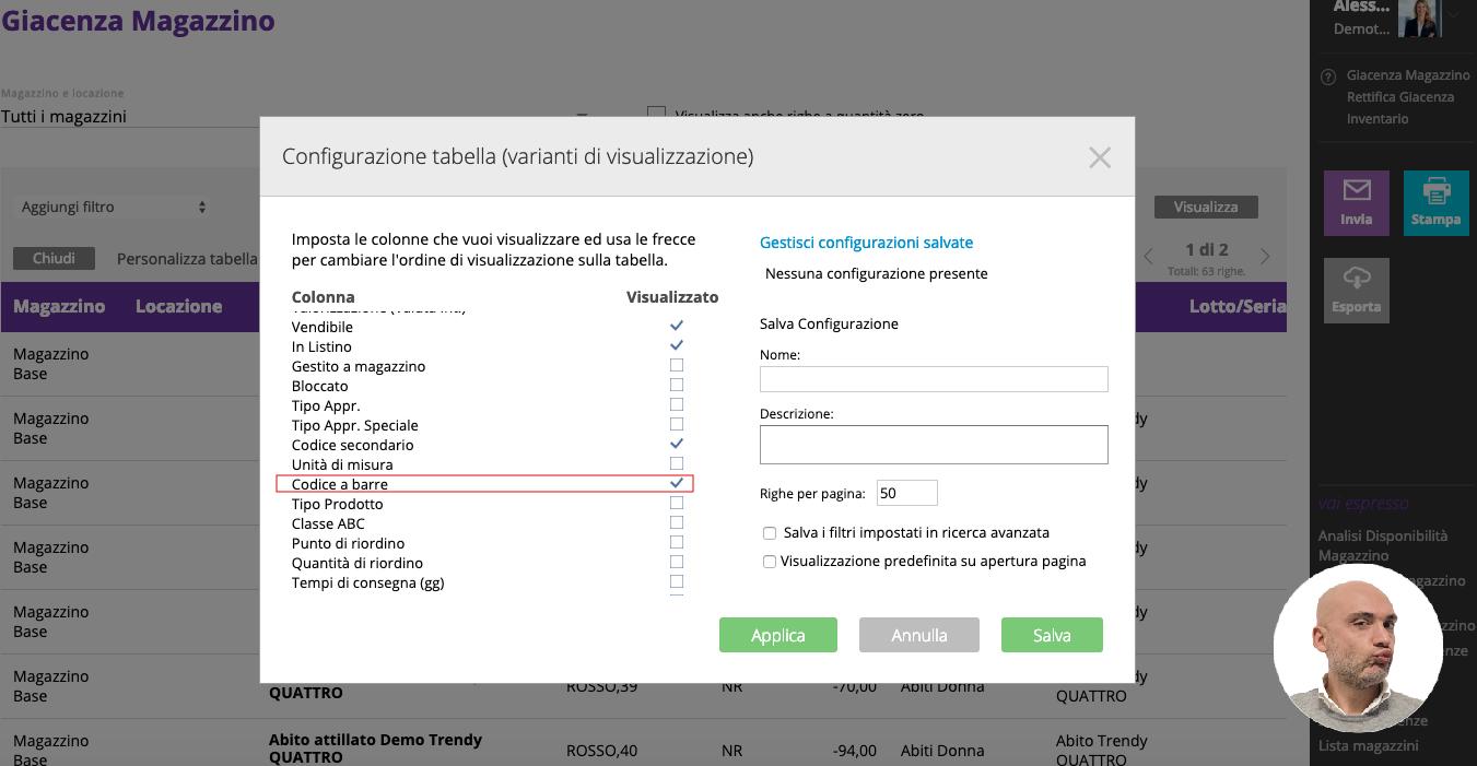 Nella sezione GIACENZA è possibile verificare la giacenza allo stato attuale, abilitando la colonna CODICE A BARRE tramite AVANZATA - PERSONALIZZA TABELLA.